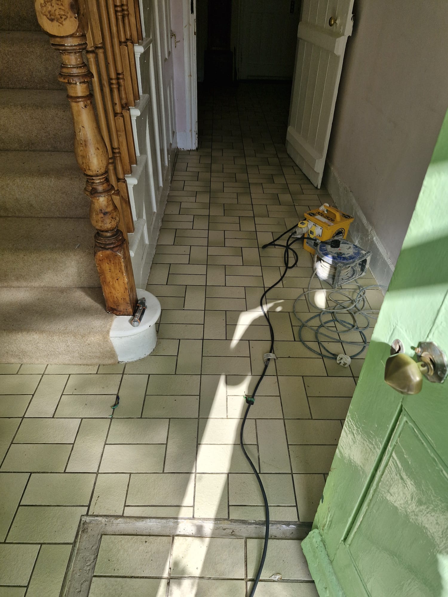 The previous tiles had been down since the 1980’s and were in great condition. It took 2 days to remove the tiles with a breaker, and another 6 days to lay the new tiles and grout.