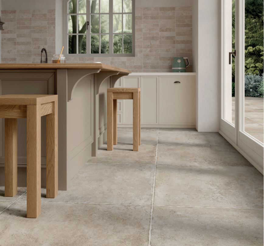 Montignac Light is designed to recall the timeless beauty of French Limestone. Multi-tonal, distressed, and rustic, this stone-effect tile has the character of a natural stone tile but the durability of porcelain.