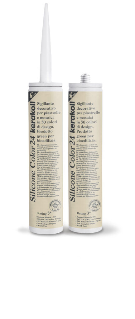 Decorative sealant for tiles and mosaics in 50 design colours. Green product for bio-building. Silicone Color develops a high degree of adhesion to non-absorbent surfaces, guaranteeing the integrity and water tightness of ceramic and porcelain coverings subject to deformation.