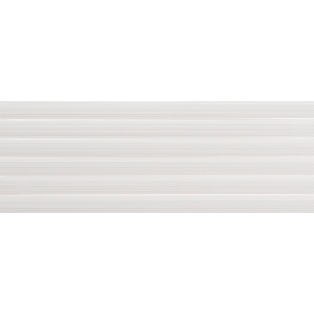 High gloss shutter effect tile, off white in colour with subtle pale grey lines throughout. White body, rectified ceramic wall tile in a large 240x690mm format.